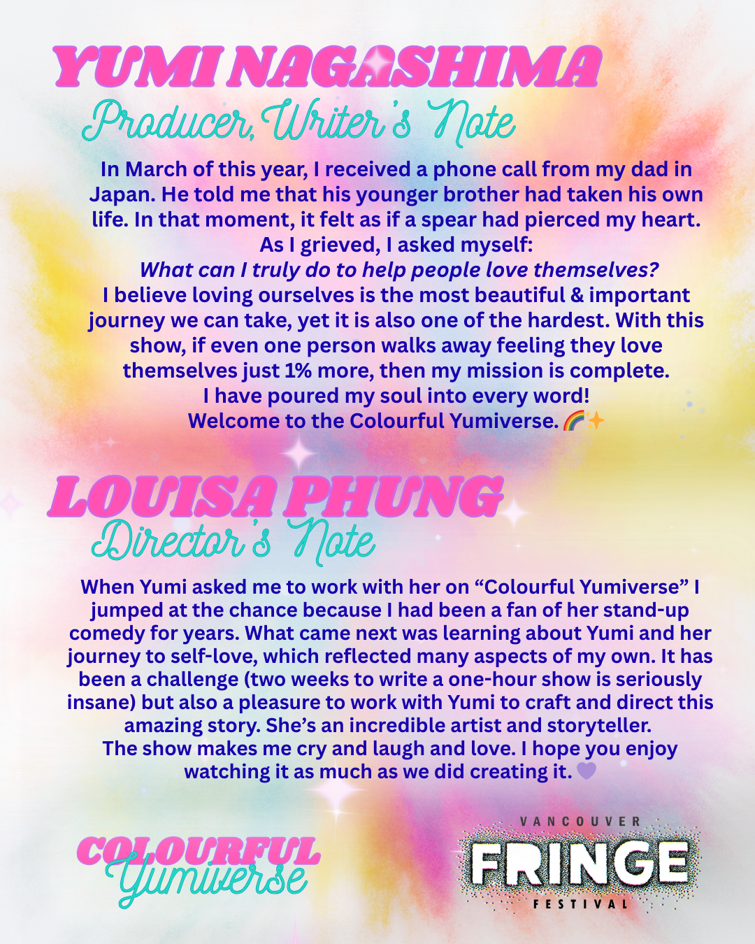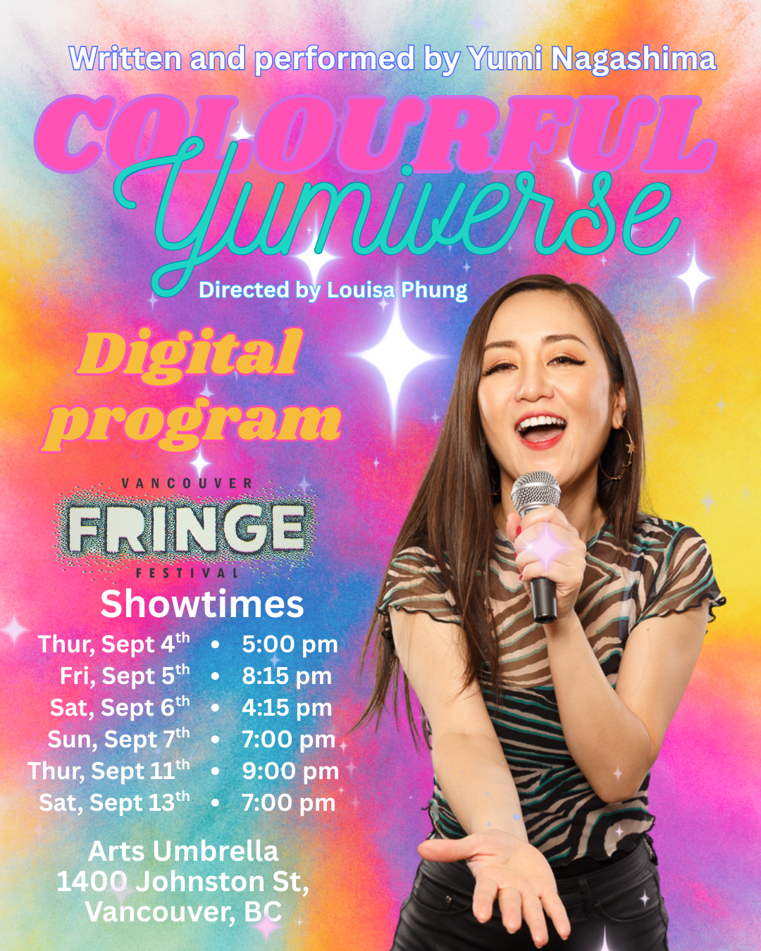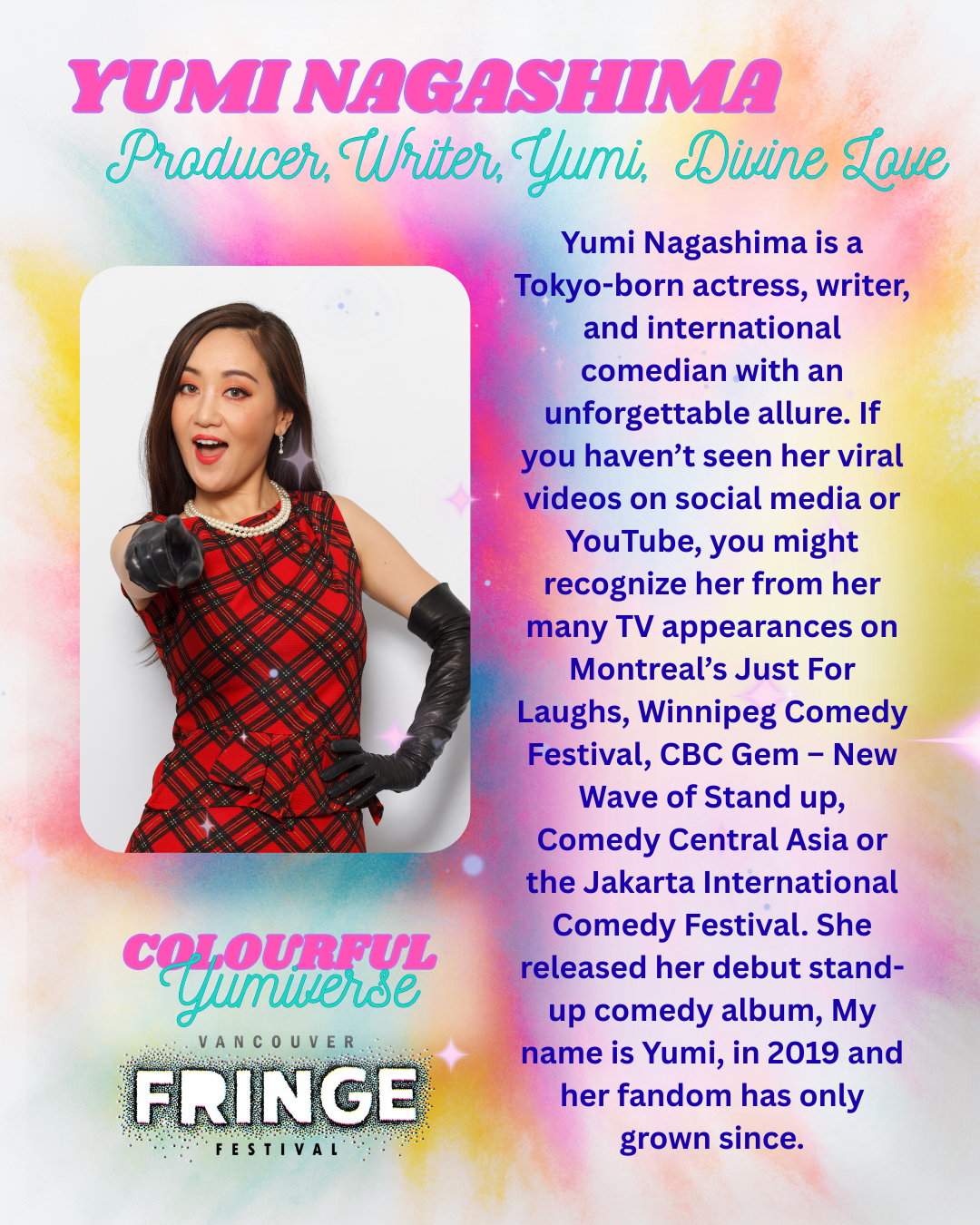 Yumi Nagashima; stand up comedian, writer, dancer, performer, and artist. What can’t she do? In her one-act one-woman show, “Colourful Yumiverse,” Yumi takes you on her journey to finding self-love. The celestial being, Divine Love, watches and guides Yumi through many trials and tribulations, supporting her through music and dance and humour until she arrives at a place where Yumi can fully love all the parts of herself.