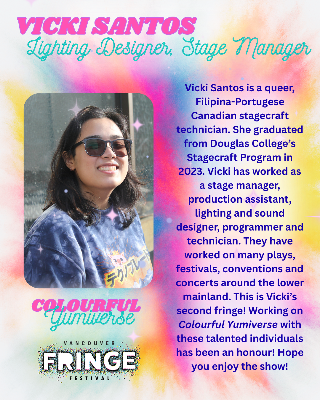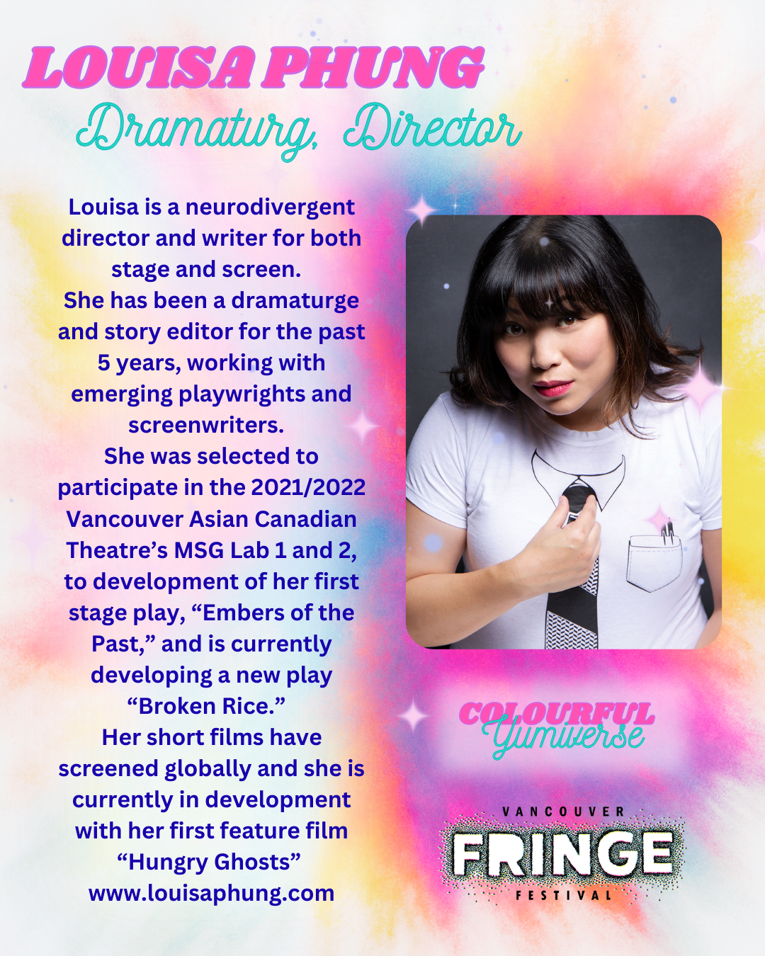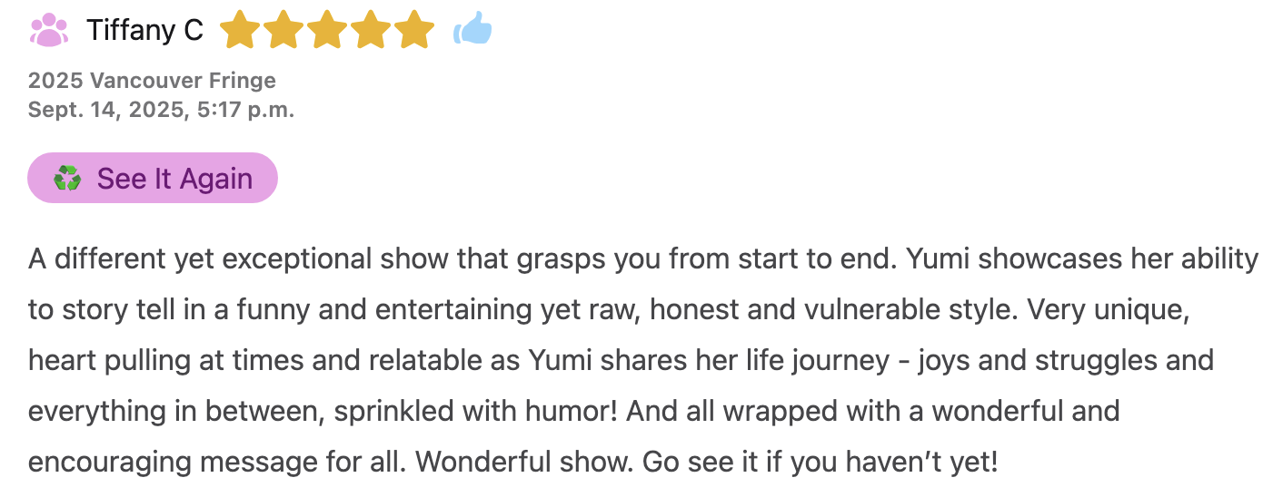 Yumi Nagashima; stand up comedian, writer, dancer, performer, and artist. What can’t she do? In her one-act one-woman show, “Colourful Yumiverse,” Yumi takes you on her journey to finding self-love. The celestial being, Divine Love, watches and guides Yumi through many trials and tribulations, supporting her through music and dance and humour until she arrives at a place where Yumi can fully love all the parts of herself.